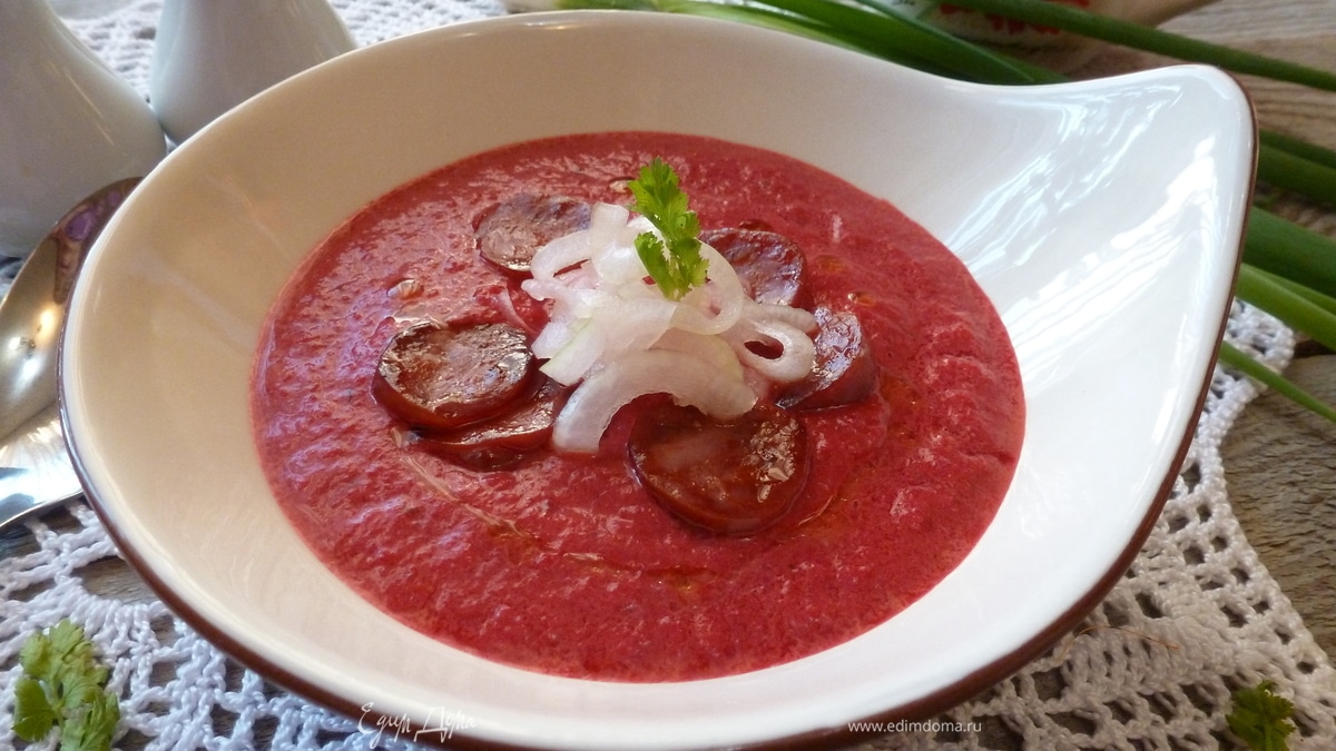 Свекольный крем-суп с чоризо и маринованным луком