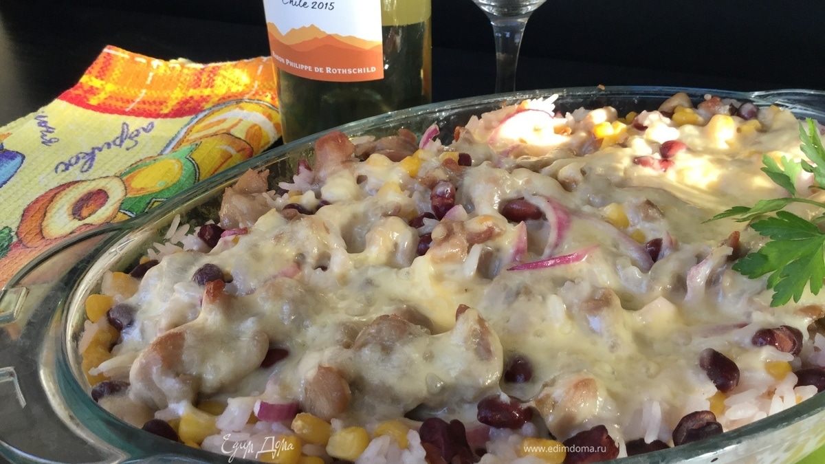 Духовку разогрейте до 180°С. С кукурузы и фасоли слейте жидкость и смешайте с рисом, курицей и луком. Выложите в форму для запекания. - Шаг 6