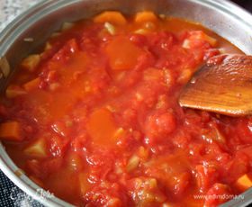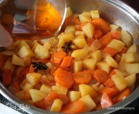 Положить к овощам томатную пасту, размешать и обжаривать 2 минуты. Добавить анис, бренди и готовить еще 2 минуты.