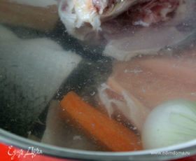 Рыбу, если нужно, почистить, помыть, сложить в кастрюлю, добавить 1 луковицу и 1 морковь, 1 стебель сельдерея, залить 2 л воды и поставить на огонь. Кроме самой рыбы в такой бульон хорошо бы дополнительно положить рыбные кости и головы, что я и сделала. Довести до кипения, добавить соль, перец горошком и варить 15 минут. В рецепте я использовала тилапию и лосося ТМ «Магуро». Замечание: не важно, какую рыбу использовать — белую или красную, важно, чтобы она не была жирной! Избыточный рыбий жир «убьет» вкус бульона.