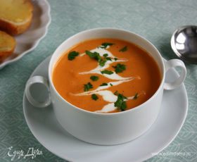 Сервировать с оставшимися сливками и зеленью петрушки. (От себя добавила гренки с сыром, как для буйабеса.) Делюсь очередным лайфхаком: чтобы узор из сливок был более выразительным, «рисуйте» не зубочисткой, а трубочкой для коктейля.