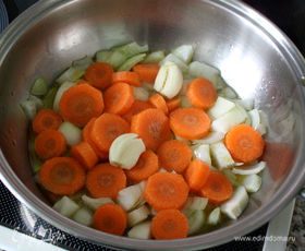 В глубоком сотейнике разогреть масло, добавить нарезанные репчатый лук, лук-порей (белую часть), морковь, сельдерей, раздавленный ножом чеснок и готовить 5 мин., помешивая.