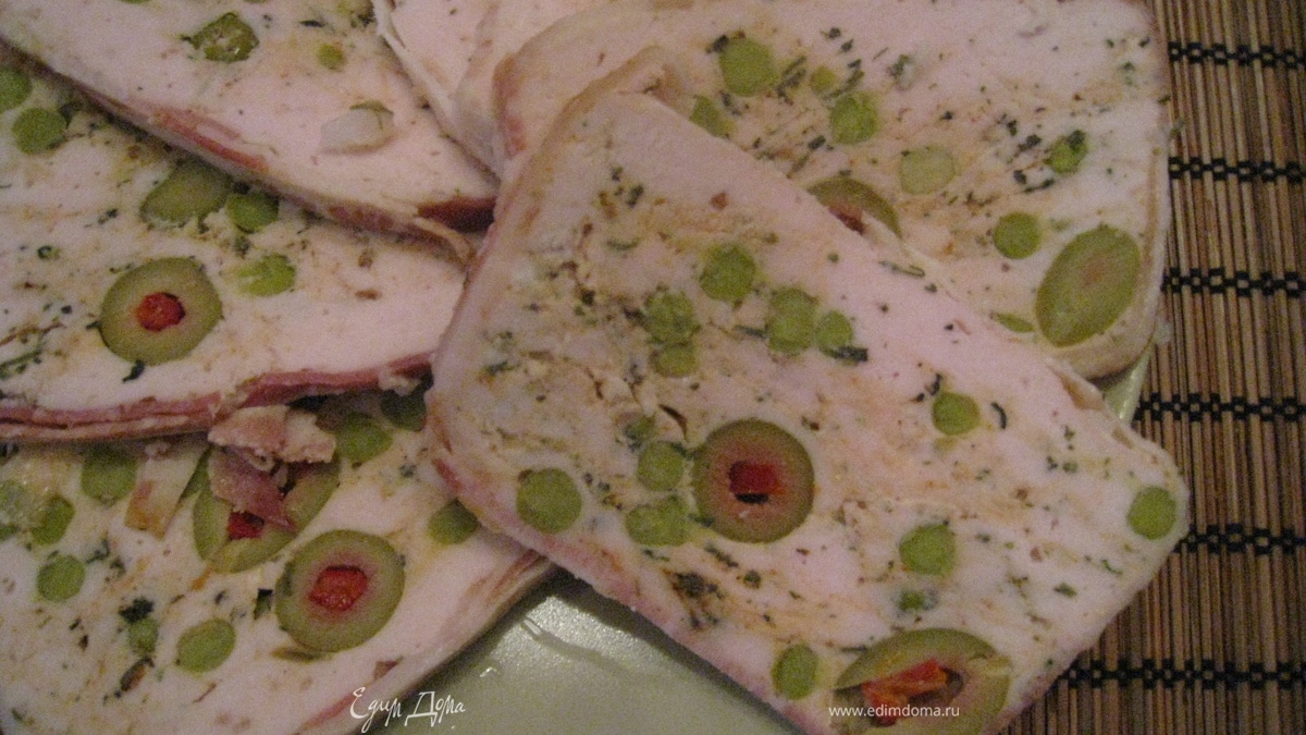 - Шаг 1Прямоугольную жаропрочную форму (дно и стенки) выложить беконом. Разогреть духовку до 180 градусов. В фарш разбить 2 яйца, добавить горошек, оливки, соль, перец, зелень, хорошо смешать. Выложить фарш в форму, накрыть беконом. Выпекать 40 - 45 минут до готовности. Остудить, вынуть из формы. Красота!