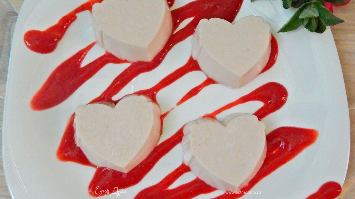 Можно внутрь положить по ягодке клубники. Остывшую панна-котту поставить в холодильник на 5 часов.