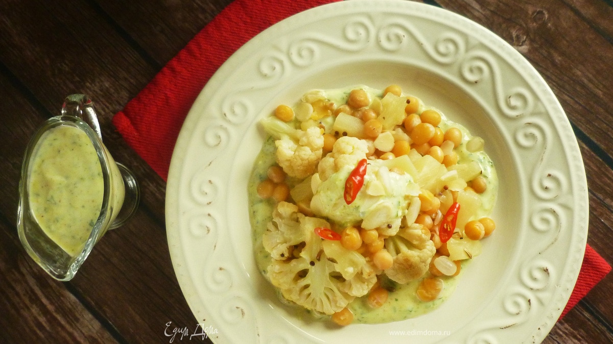 На первый взгляд сочетание цветной капусты и ананасов может ввести в заблуждение. На самом деле получается отличное легкое блюдо с очень ярким вкусом. Здесь много разных пряностей и острая имбирно-йогуртовая заправка. Ананасы можно взять как свежие, так и консервированные. А семена горчицы —