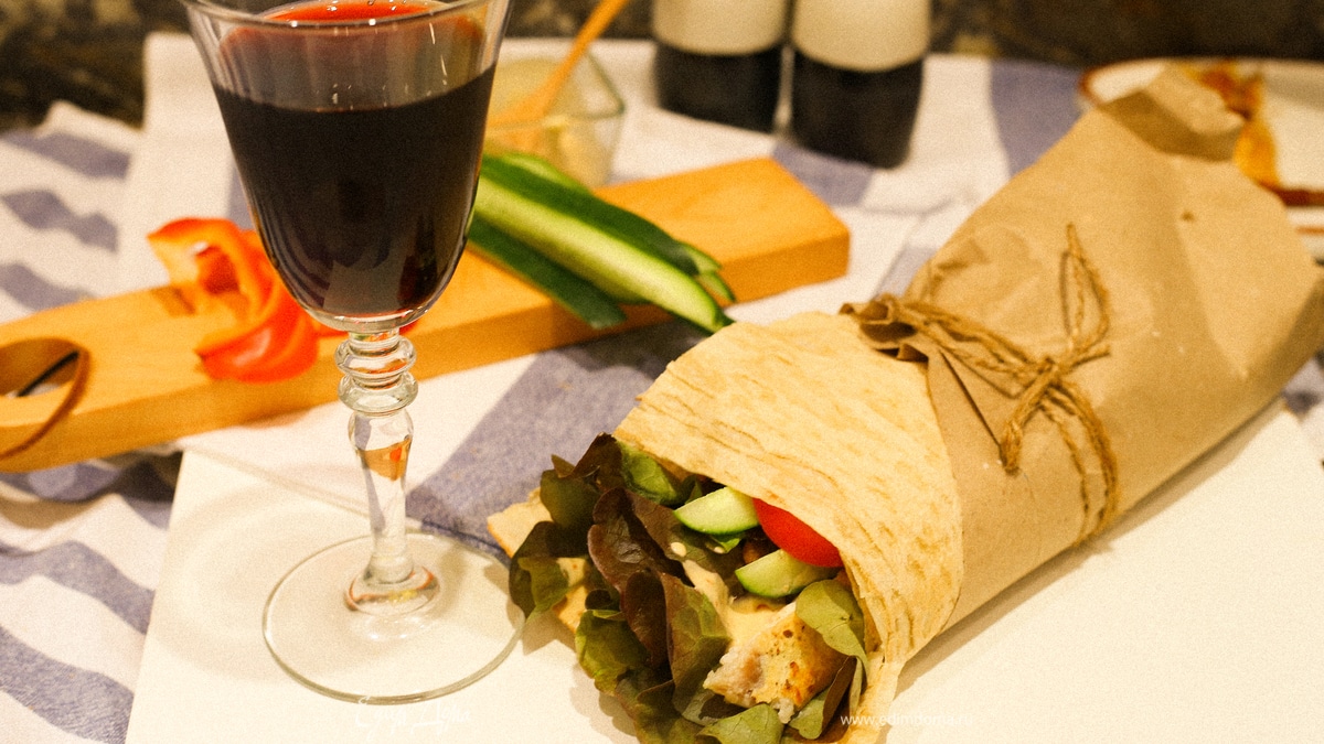Для удобства можно завернуть нижнюю часть шаурмы в бумагу или салфетку. - Шаг 11