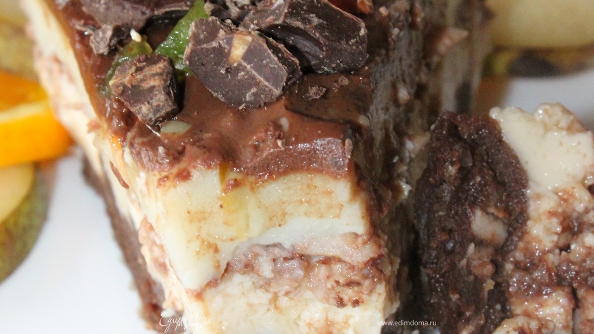 - Шаг 1I. Для флана яйца взбить со сгущёнкой, подмешать молоко.Вылить в разъёмную форму. Для бисквита: яйца взбить с сахаром, добавить растопленный шоколад и масло, перемешать с сухими продуктами. Равномерно вылить на флан. Заранее разогреть в духовке форму большего размера с водой (чтобы на 1/3 покрывала флан), Погрузить туда форму с фланом и выпекать 40-50 минут. Бисквитная часть в процессе выпечки оказывается сверху! Поставить на ночь в холодильник. Охлаждённый флан аккуратно на тарелку и аккуратно вернуть снова в форму. II. Кокос потереть (желательно на мелкой тёрке), немного проварить со сгущённым молоком, добавить поломанный шоколад,растопить. Остудить, выложить на флан. III.Из 3 лимонов выжать сок, смешать с сахаром, водой и цедрой 1 лимона. Тщательно взбить яйца и перемешать с лимонной смесью. Поставить на огонь,добавить кусочек масла,варить, постоянно помешивая до загустения. Заранее замоченный желатин растопить, ввести в охлаждённый лимонный крем и вылить поверх кокосовой прослойки. IV. Верх украсила шоколадной глазурью, рубленным шоколадом и сухофруктами.