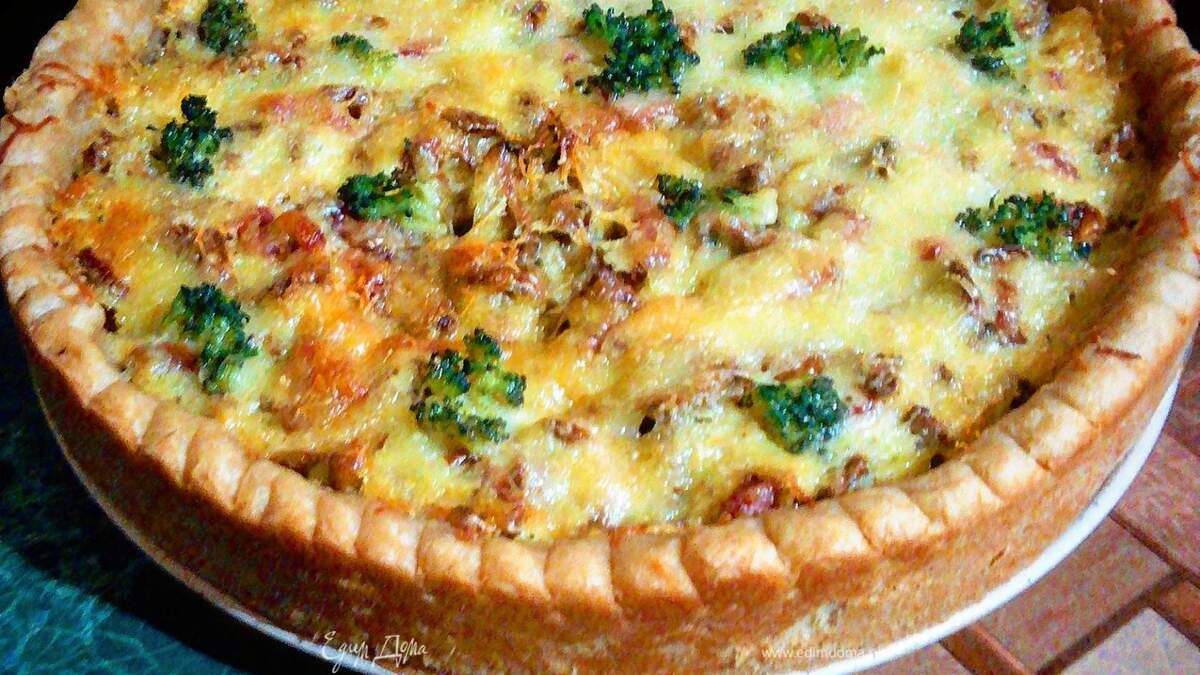 - Шаг 7В нашу форму кладем начинку, равномерно распределяем, посыпаем сыром и украшаем брокколи, ставим в духовку при температуре 200°С на 40 минут.