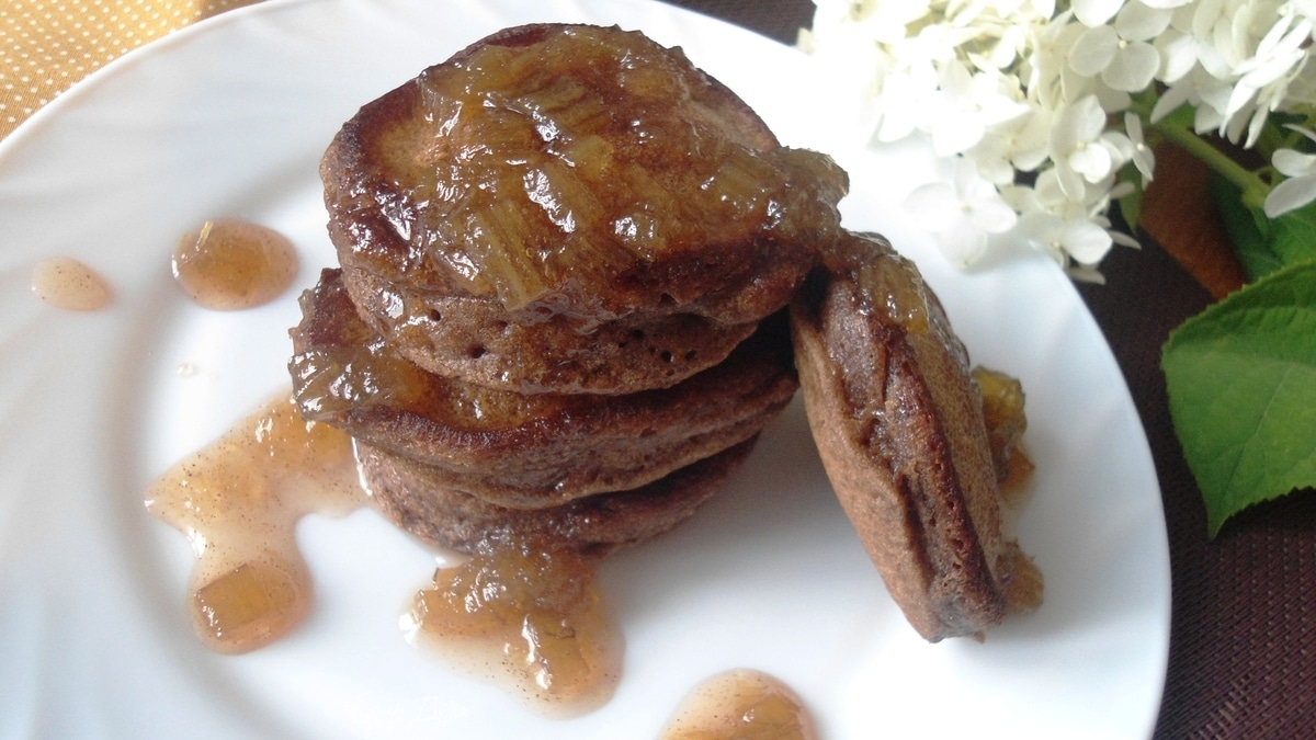 Шоколадные оладьи с ревеневым соусом