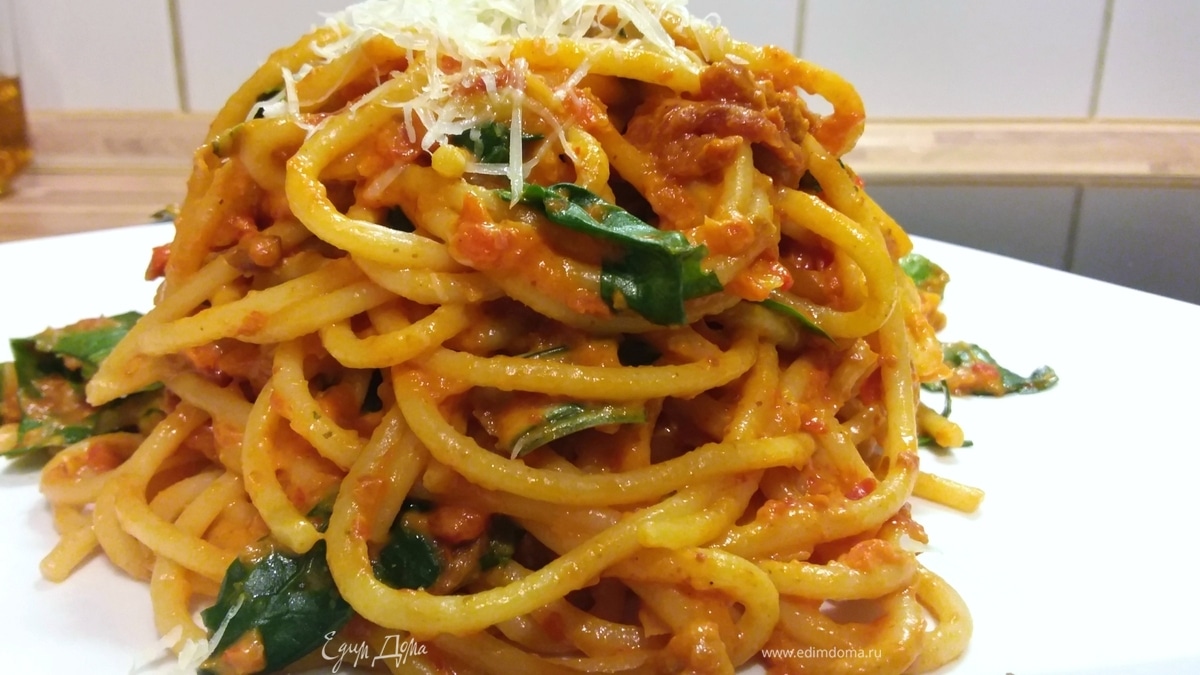 Спагетти в красном — название обобщающее. Просто соус, с которым подается паста, красного цвета. Он и является изюминкой рецепта, уж очень богатая и необычайно яркая вкусовая гамма в нем собрана.