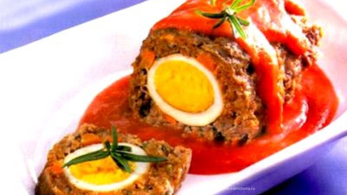 - Шаг 1Сварить морковь, картошку и 3 яйца вкрутую. Остудить. Морковь и картошку порезать на кубики как для оливье. Яйца очистить от скорлупы. В фарш добавить измельченный лук, петрушку, чеснок, сырое яйцо, соль и специи, ломтик хлеба размоченный в молоке. Хорошенько вымесить, постепенно добавляя воду. Выложить фарш на кусок пекарской бумаги и распределить по ней равномерно толщиной 2 см. Должен получится прямоугольник длины вашего противня и примерно 25-30 см в ширину. Выложить вдоль горкой посередине прямоугольника морковь, картошку, горошек. Затем положить среди овощей 3 сваренных яйца. Свернуть рулет. Для этого завернуть один край прямо с пекарской бумагой как можно плотнее к овощам. Осторожно отсоединить бумагу. Затем навстречу завернуть другой край и соединив их вместе хорошенько сравнять стык, также защипать и оба других отверстия, чтобы получился гладкий со всех сторон закрытый рулет. Сверху прямо рукой смазать ложкой томатной пасты, затем взбитым желтком. Осторожно перенести рулет вместе с бумагой на противень и запекать минут 40 в духовке при 180 градусах. Подавать с картофельным пюре! Очень и очень вкусно!