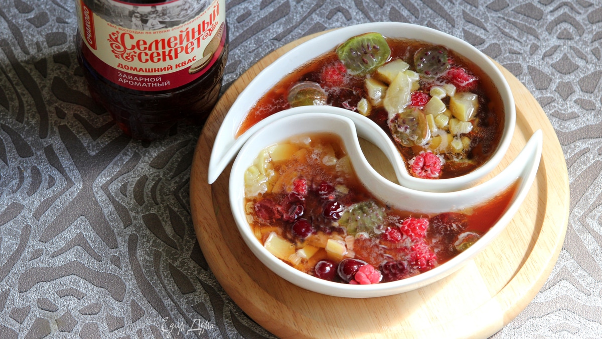 Ягоды перемешать, добавить мед и квас «Семейный секрет. Домашний. Заварной ароматный». Летняя окрошка готова, приятного аппетита!