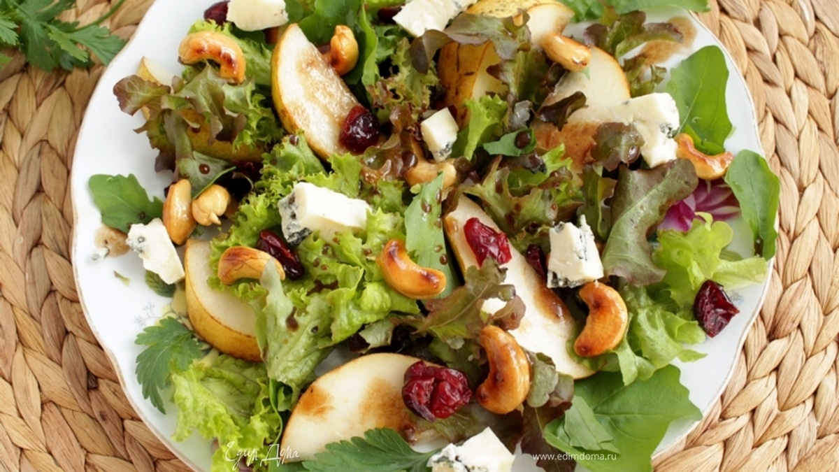 Руками нарвать салат, порезать дольками грушу, добавить кешью, клюкву. - Шаг 5