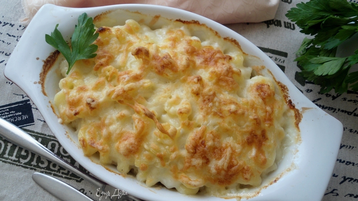 Американскую запеканку мак-н-чиз, конечно, все знают, предлагаю вам более сытный вариант, с курочкой. После того как вынете запеканку из духовки, дайте ей остыть 5 минут и подавайте!