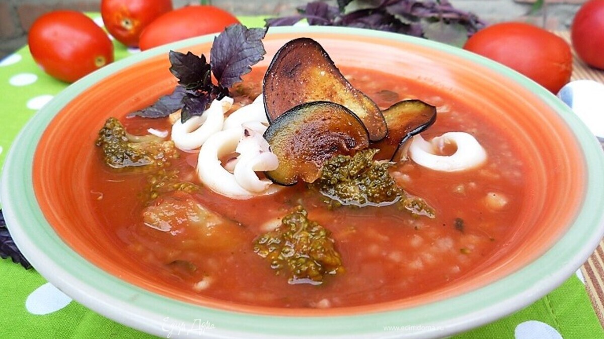 Подаем суп с хрустящими баклажанами, украшаем колечками кальмаров, зеленью или базиликом. Приятного аппетита!