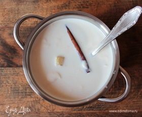 Сливки 10% нагреть с кусочком имбиря и палочкой корицы, довести до кипения, убрать с плиты, накрыть крышкой и дать настояться пряностями. Вместо сливок можно также использовать обычное молоко.