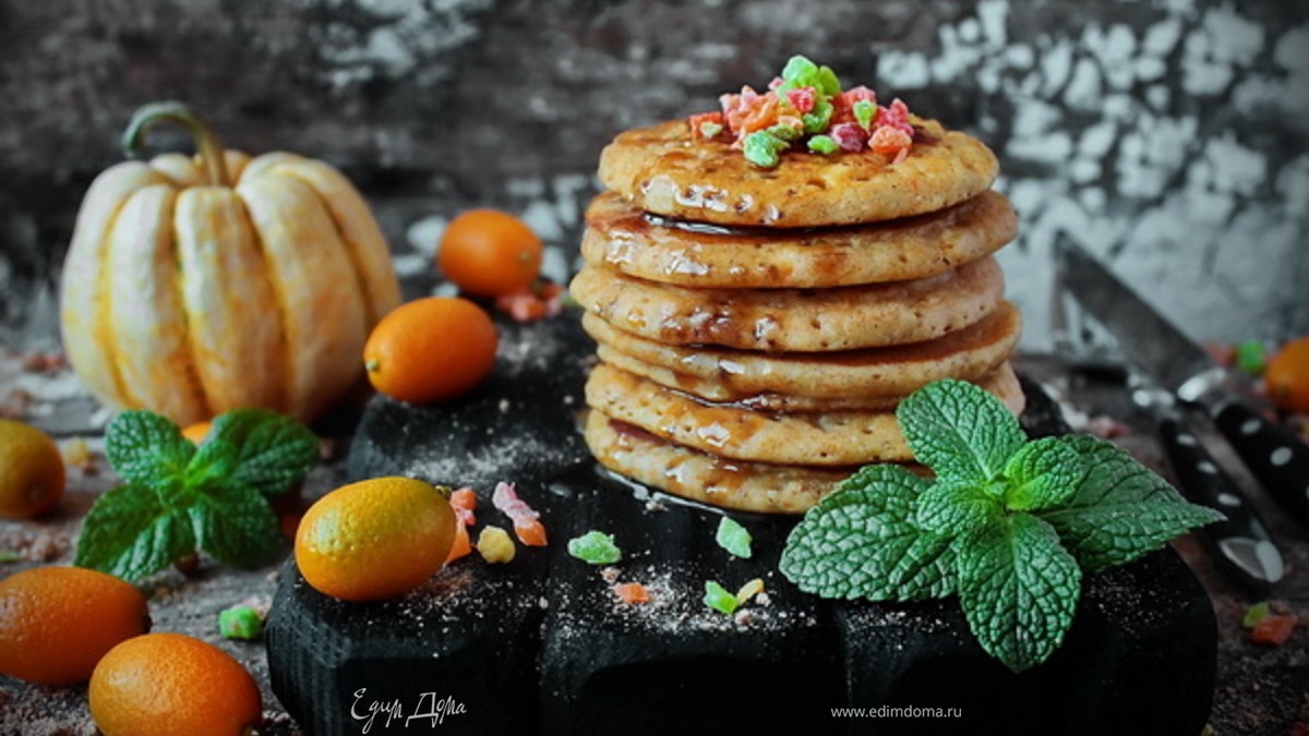 Готовые тыквенные блинчики подавать по желанию с карамельным сиропом, цукатами и веточкой свежей мяты. Также их можно заменить на сметану и любимое варенье.