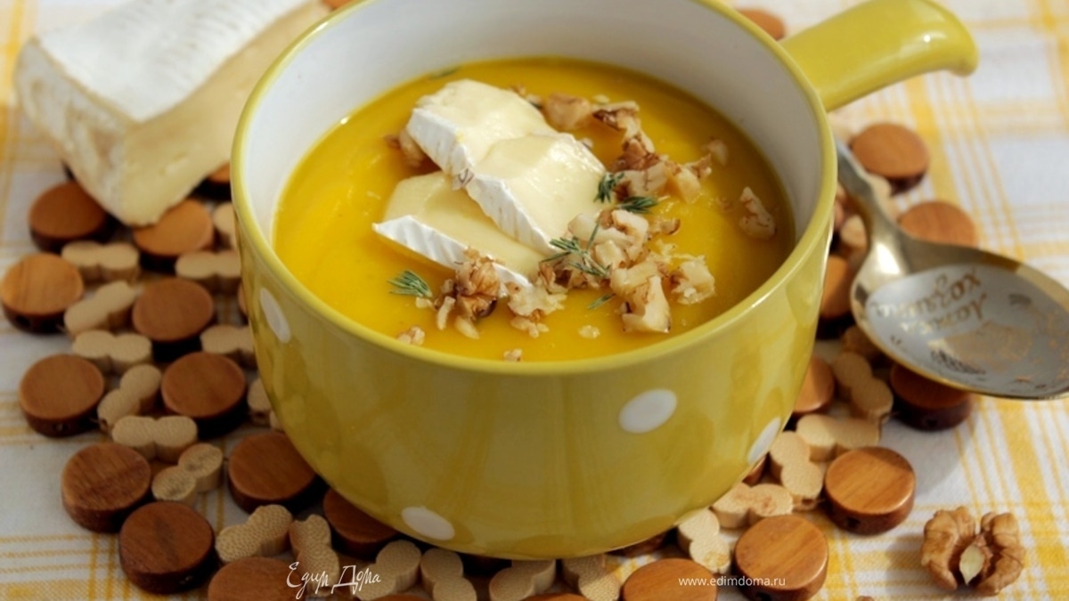 Шелковая структура тыквенного супа дополнена пикантным сыром с белой плесенью и хрустящими орешками.