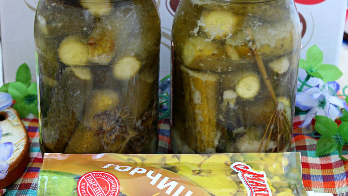 Я считаю, что это лучший рецепт маринованных огурцов с готовой горчицей, потому что огурчики получаются хрустящие, в меру острые, ароматные. Хорошо хранятся. Хочу заметить, что несмотря на не очень презентабельный вид маринада, внешний вид самих огурчиков абсолютно не страдает. Расчет в рецепте дан на 2 банки объемом 0,9 литра.