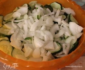 Огурцы порезать ломтиками, лук четвертинками колец.