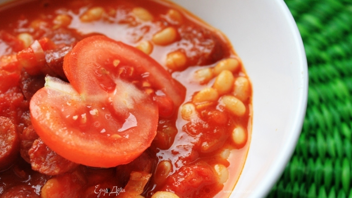 Томатный суп с колбасками и фасолью