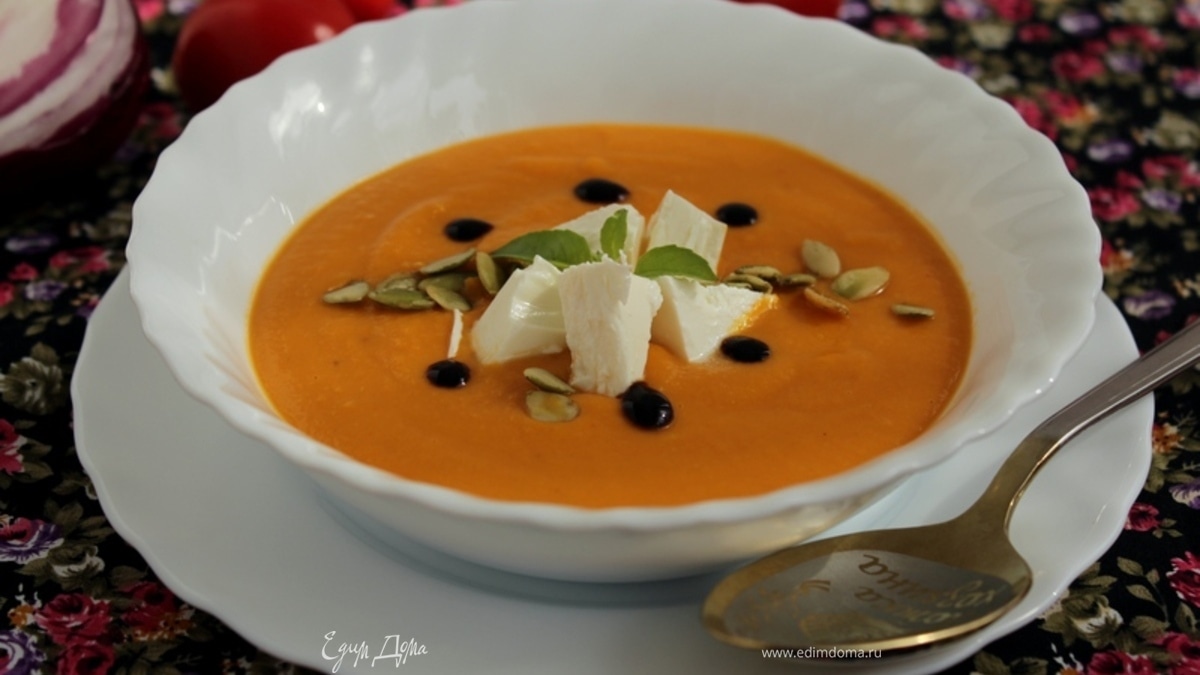 Суп благодаря кисло-сладкому вкусу томатов сочетается со множеством продуктов. Сливки и брынза послужат прекрасным дополнением.
