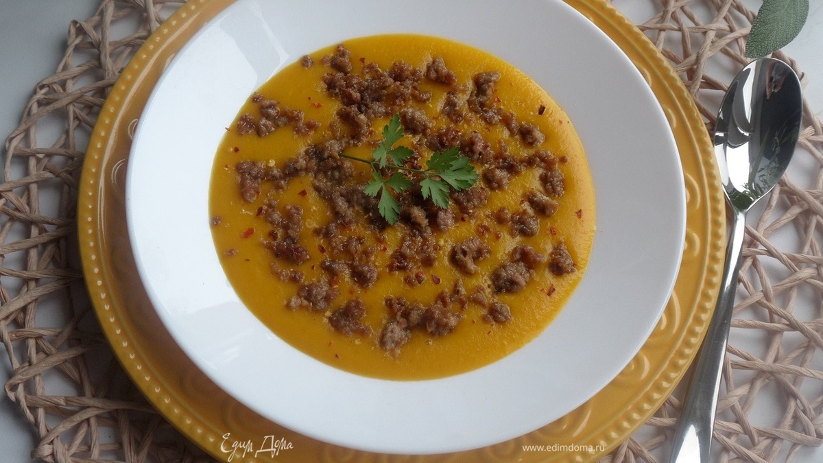 Вкусный, яркий, питательный суп-пюре из тыквы, моркови, лука и чеснока с добавлением обжаренного фарша и перчика чили! Быстро, просто и остро!
