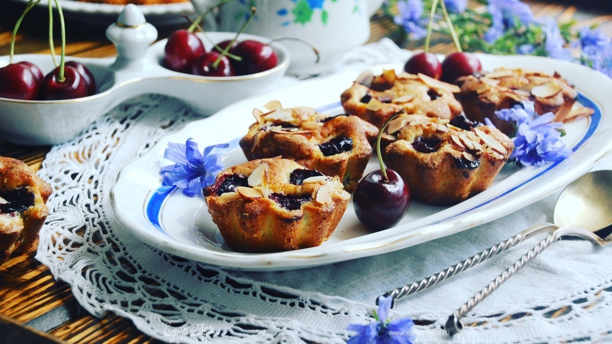 - Шаг 4Формочки смазать сливочным маслом, наполнить 1/2 часть тестом. Сверху выложить часть черешни и посыпать корицей. Поставить формочки в духовку, разогретую до 180°С. Когда черешня утонет в тесте, сверху выложить оставшиеся ягоды. По желанию можно посыпать миндальными лепестками. Выпекать до сухой зубочистки.