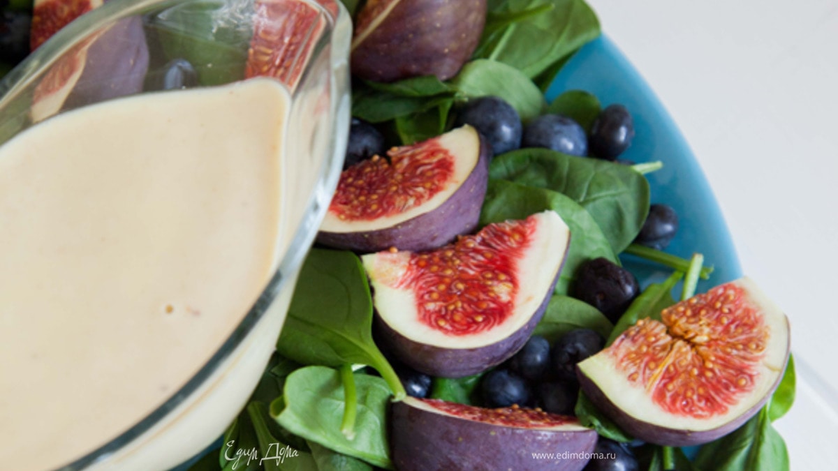 В конце добавляем инжир. Свежий инжир можно есть целиком, чистить его не нужно. Заправлять салат советую по вкусу уже порционно, а не весь салат сразу.