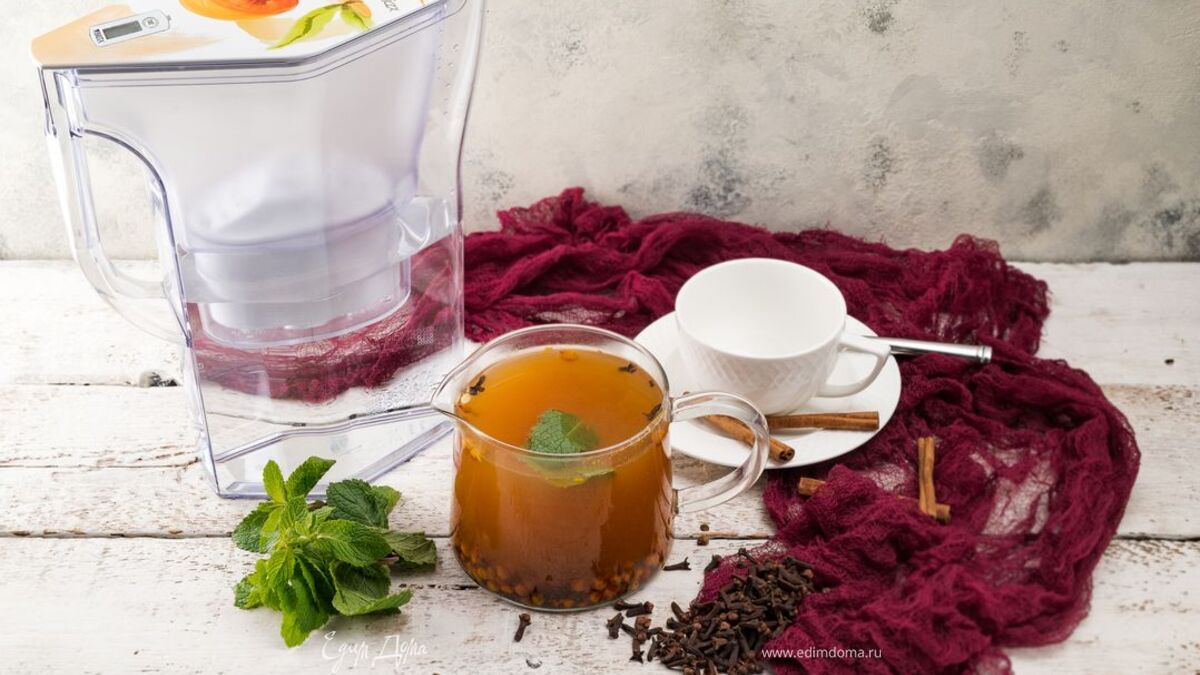 Добавить в чай листики мяты и гвоздику по вкусу. Дать напитку настояться 5 минут и подавать теплым. Приятного чаепития!