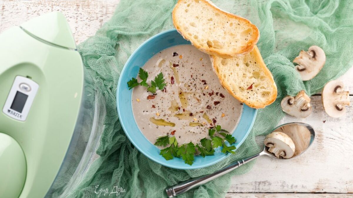 Часть готового бульона отлейте в отдельную емкость. В основную часть бульона в кастрюле поместите грибы с луком и измельчите до однородной массы. - Шаг 7