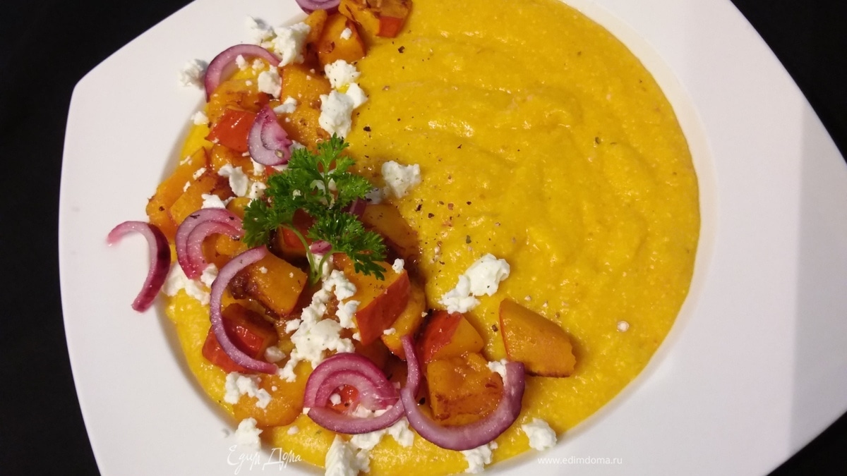 Сервировать поленту, выложив кусочки обжаренной тыквы, маринованный лук, кусочки брынзы (феты). Украсить петрушкой. - Шаг 11