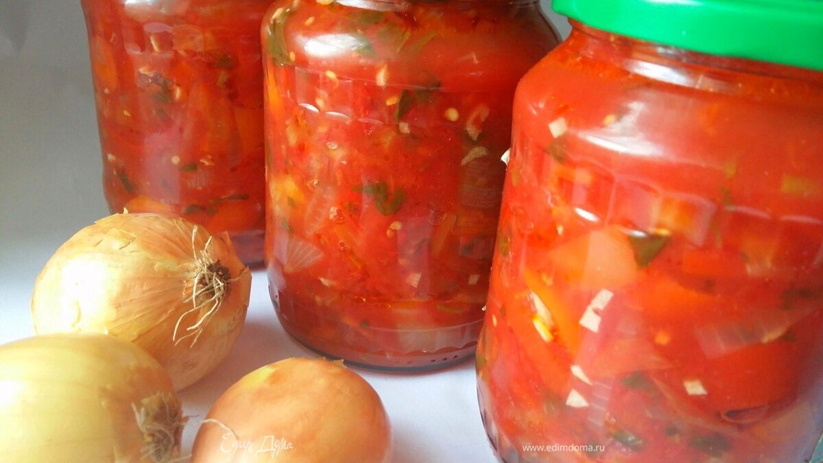 В любую глубокую посуду, в которой делаете заготовки, вылить подготовленный томат, добавить в него лук, морковь. Дать закипеть и проварить в течение 5 минут при среднем кипении.