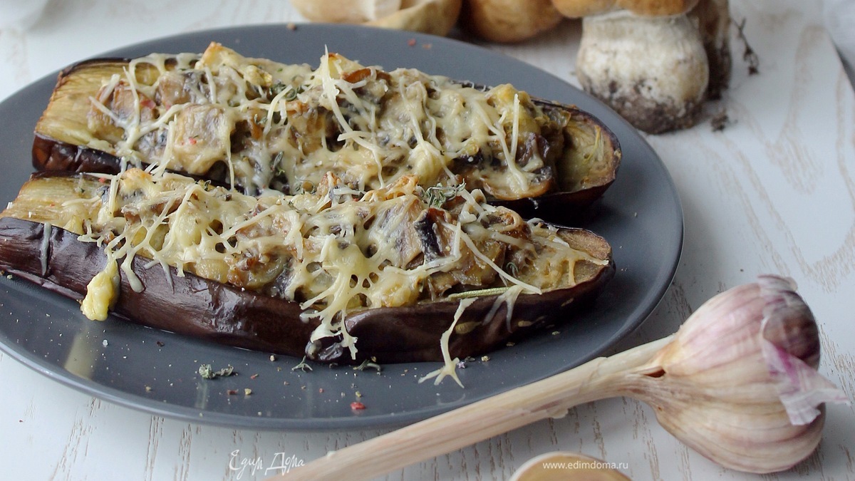 Из половинок баклажанов сделать «лодочки»: достать мякоть ложкой. Мякоть порезать кубиками и смешать с грибами. Добавить майонез ТМ «МахеевЪ», натертый сыр, посолить, поперчить. Заполнить «лодочки» начинкой и запекать в духовке при 180°С 15 мин.