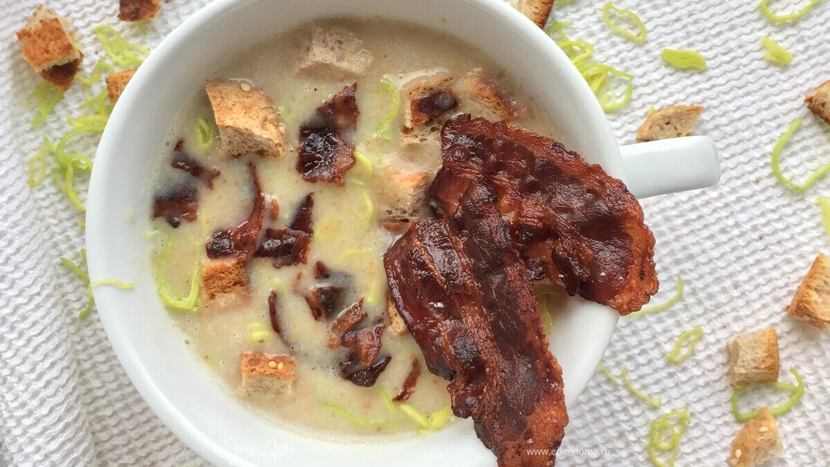 - Шаг 4На сухую сковороду выкладываем ломтики бекона. Обжариваем с двух сторон каждый в собственном соку. Параллельно нарезанный на небольшие кубики хлеб подсушиваем до золотистого цвета. Суп разливаем по глубоким тарелочкам. Добавляем бекон и сухарики по вкусу.