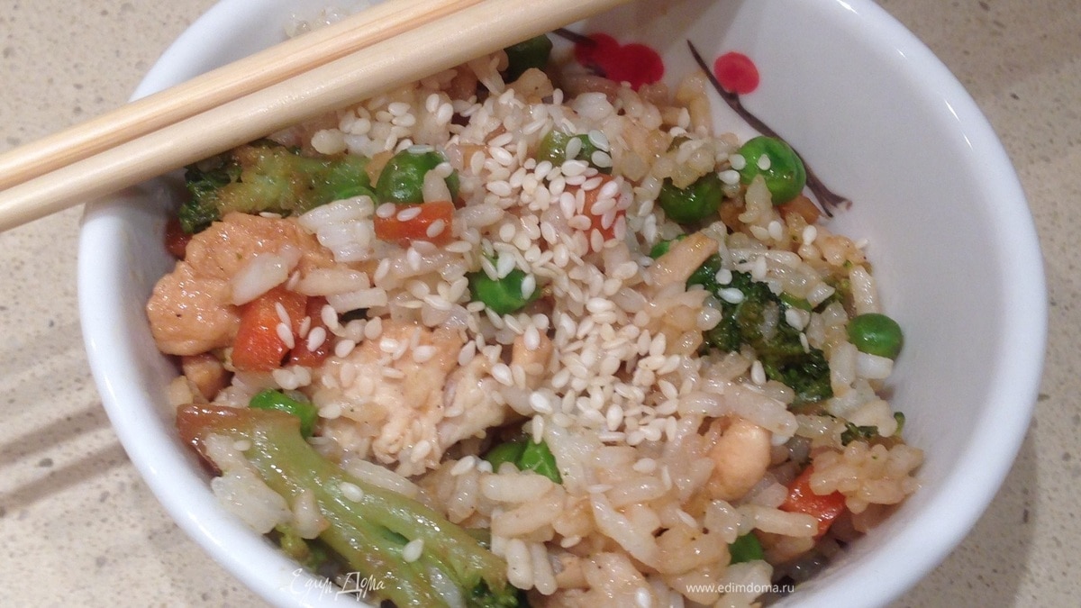 Простое и не очень вредное повседневное блюдо. Если хотите, чтобы получилось полезнее, замените обычный рис на бурый и используйте соевый соус с уменьшенным содержанием соли (у меня был именно такой). Если имбиря и чеснока кажется много, возьмите поменьше. Вместо кунжутного масла можно использовать и подсолнечное.