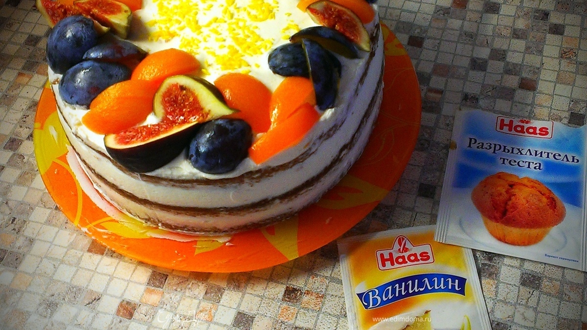 Обрезаем коржи, смазываем кремом и украшаем на свой вкус, в моем случае это фрукты: сливы, абрикосы и инжир.