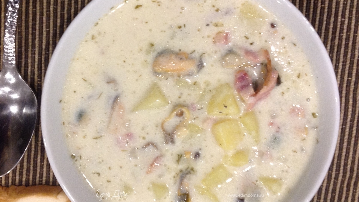 В кастрюлю к луку и бекону влить теплое молоко, стакан горячей воды и отвар от мидий. Проварить 5 мин, добавить картофель и мидии. Варить 4 мин. В конце влить сливки и добавить петрушку, соль, перец. Дать закипеть и снять с огня.
