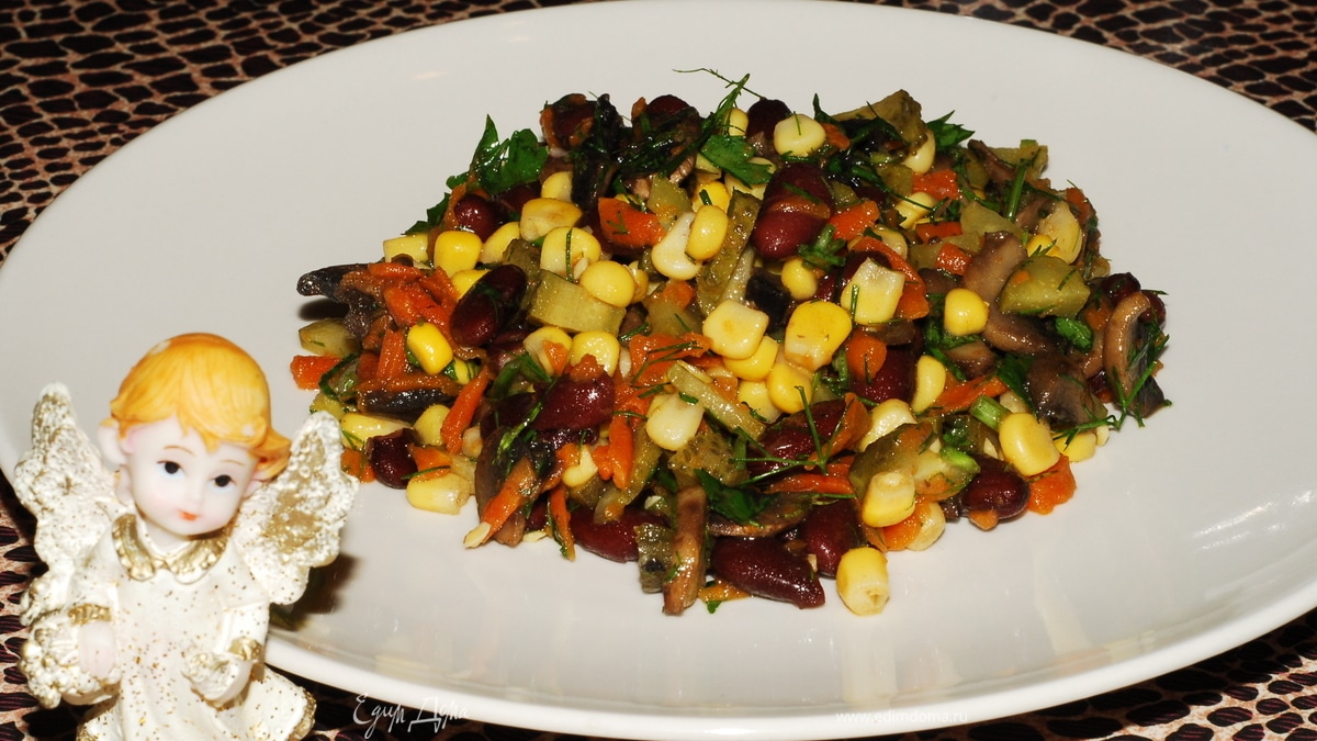 - Шаг 11.Музыка! Наверное, я бы составил плэйлист из каких-нибудь записей Rolling Stones, но готовил вообще под трансляцию матча ЧМ-2010. Что бы не сопровождало процесс приготовления пищи, морковь для этого салата вам придется отварить. После дать немножко остыть – можно помочь моркови с этим, опустив её в холодную воду. С отваренной моркови кожица снимается очень легко и можно даже вообще её оставить. Так или иначе трём морковь на средней терке. 2.Грибы обжариваем на растительном масле. Обжариваем их до мягкости и до появления приятного цветового оттенка – так будет хорошо! 3.Кукурузу и фасоль открываем, предварительно спустив сок из банок. Добавляем и кукурузу и фасоль в ту посудину, где их дожидаются тертая морковка и грибы. 4.Зелень мелко режем или рвём руками и засыпаем всё туда же. 5.Корнишоны режем не крупно и тоже в общую кучу! Думаю, что интересный вкус дадут в таком салате и соленые огурцы. Хотя, с другой стороны, не хочется терять тот сладкий привкус, который дают корнишоны. Думайте сами! 6.Перец режем примерно так же, как и огурчики, чтобы всё это вкусно выглядело. 7.Замешиваем всё, что понарезали и понатерли, заправляем маслом и солим. Я заправлял оливковым маслом, потому что ничего лучшего я этому салату предложить не мог! Было льняное, но, несмотря на всю его полезность, я не всегда могу мириться с его «горчинкой». Заправил бы подсолнечным маслом первого отжима, но оно в моих запасах банально закончилось. 8.Ну что, кажется всё!? Приятного аппетита. Не смотрите футбол за ужином – прием пищи и футбол плохие друзья! Будьте здоровы!