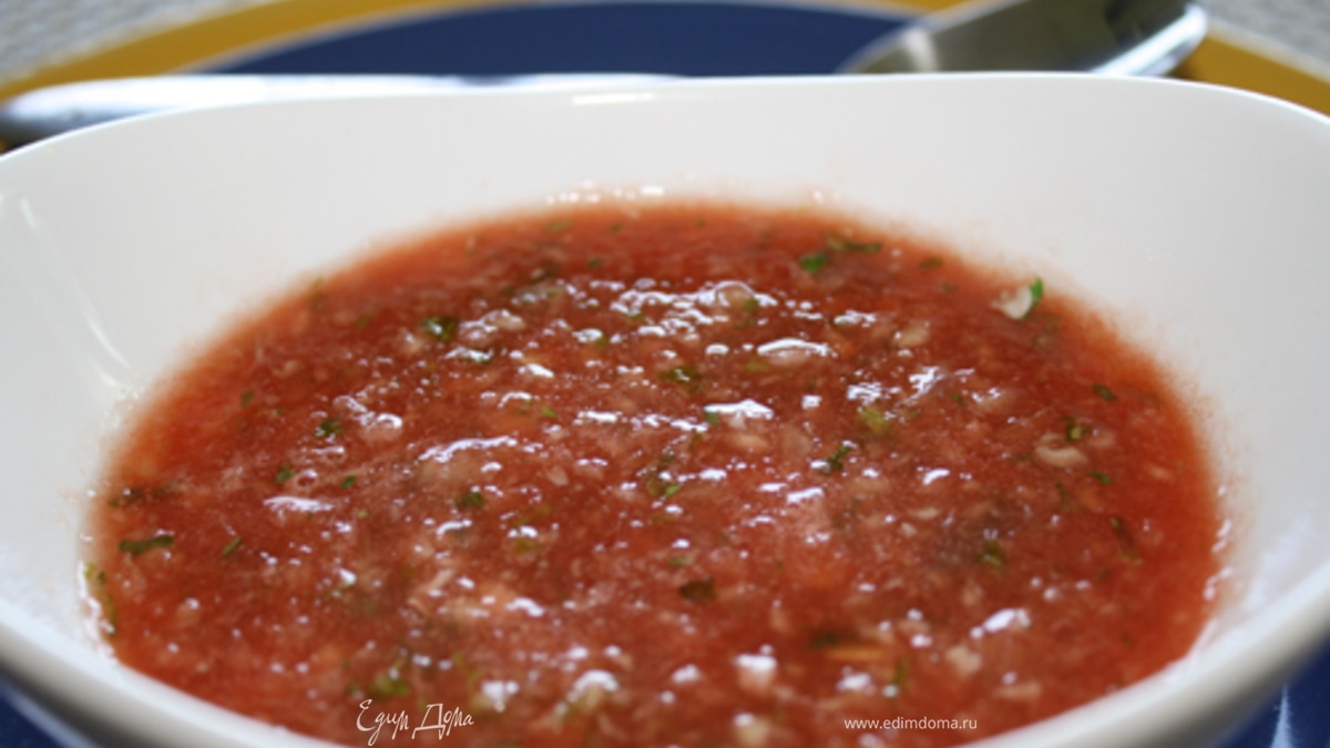 Суп из арбуза с огурцом , лаймом и кинзой