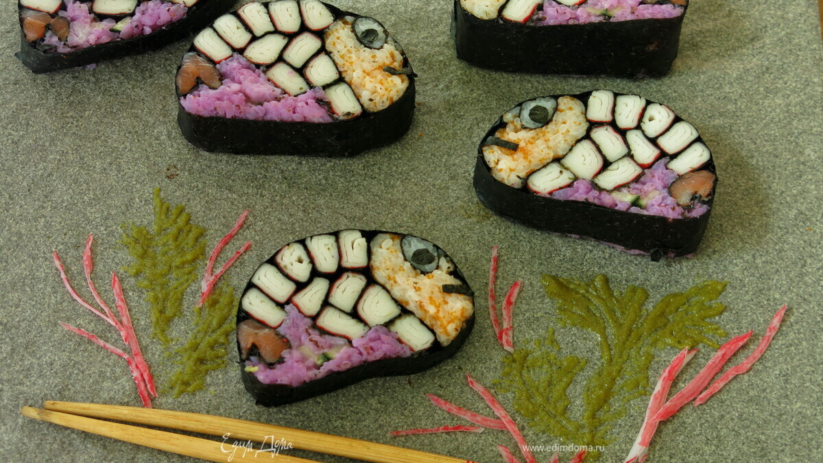 Суши кадзари «Рыбки» — рецепт с картинки на японском сайте, только состав немного подкорректировала и раскрасила. В исходнике вся рыбка из риса, хвостик из колбасы, мой вариант — чешуя из половинок крабовых палочек, хвостик — красная рыба, голова — рис с икрой, вода — рис с соком краснокочанной капусты. Надеюсь, описание понятное и любители суши попробуют! Приятного!