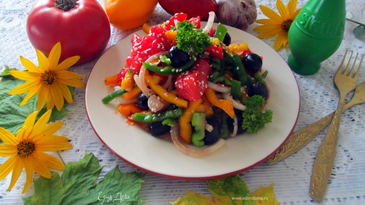 Вкуснейший полезный салат из овощей с маслинами и с интересной заправкой понравится любителям здоровой пищи! Добавление итальянских приправ делает салат еще ароматнее.