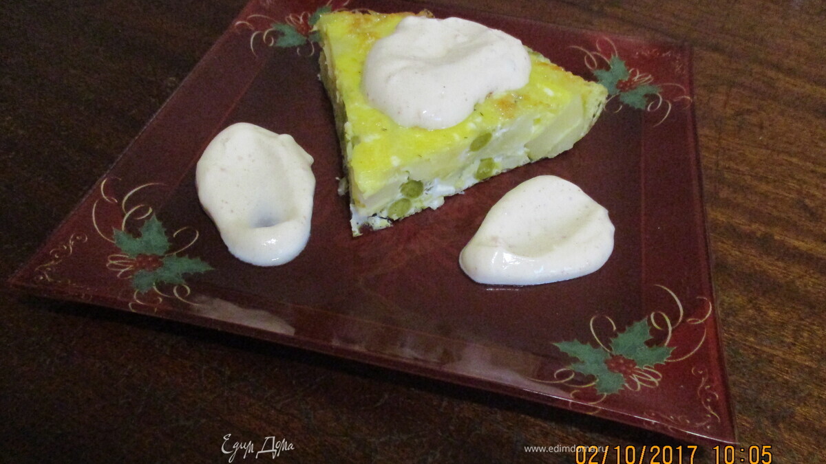 - Шаг 4Омлет достаем, режем на треугольники, кладем на тарелку, сверху добавляем соус.