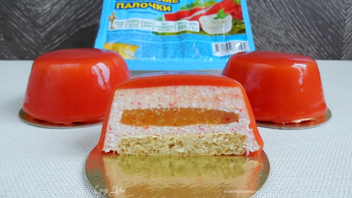Муссовые десерты сейчас очень популярны. Но я вам предлагаю приготовить не десерт, а закуску, созданную по принципу муссового пирожного. Нежный сливочный мусс из крабовых палочек скрывает конфи из персика с чили, а панкейк с киноа завершает экзотическую композицию. Яркая красная глазурь, с одно стороны, повторяет окрас