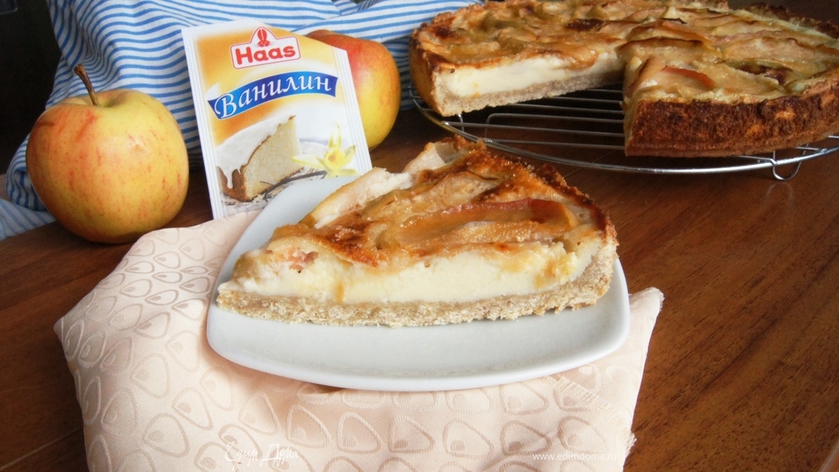 Нарезать на кусочки и подавать к чаю. Хрустящий корж, нежная ванильная начинка и карамелизованные яблочки!