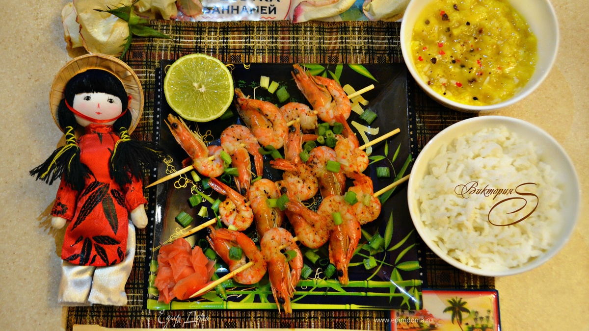 Нанизать креветки на деревянные шпажки (шпажки предварительно необходимо подержать 15-20 мин. в теплой воде). Сбрызнуть соком лайма и обильно посыпать свежемолотым перцем. Обжаривать креветки по 2 мин. с каждой стороны на разогретом и смазанном маслом гриле.