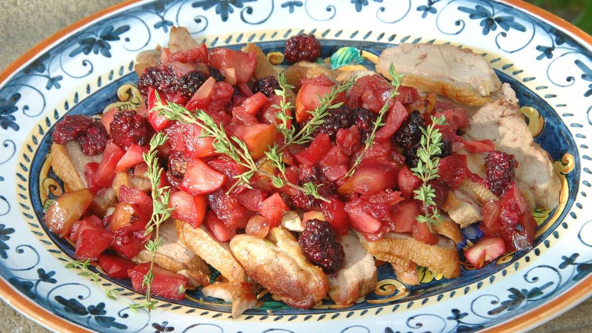 Приготовить соус: нарезанные яблоки и ежевику поместить в тяжелую кастрюлю, всыпать сахар и черный перец, влить портвейн, 2 ст. ложки воды и прогревать все до полного растворения сахара. - Шаг 7