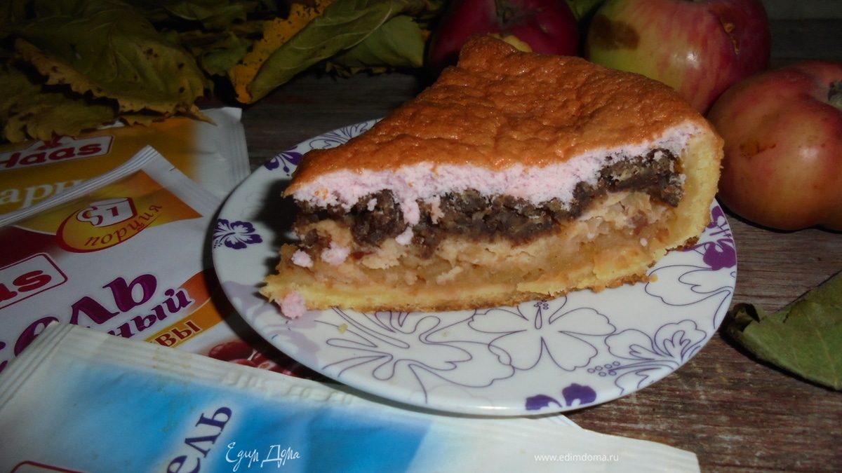 Отличный трехцветный пирог. Нежное песочное тесто, ароматная яблочная начинка, тертый темный слой какао и нежнейший слой безе с вишневым киселем от HAAS.
