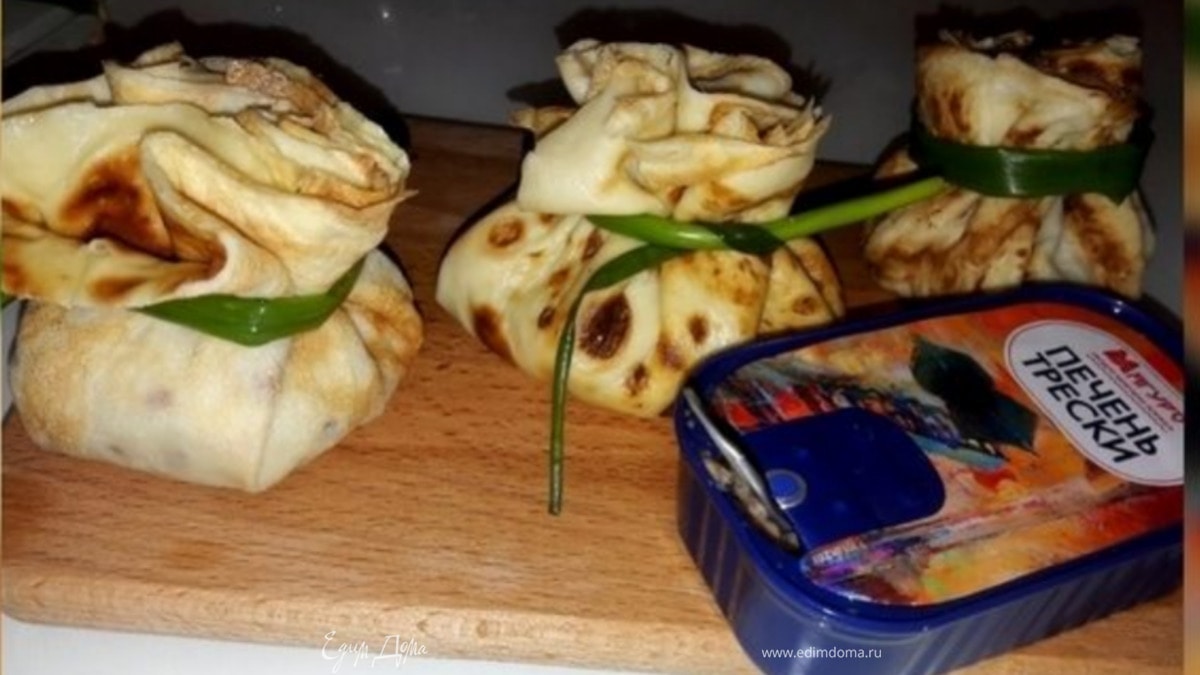 В серединку блина выложить начинку, собрать в мешочек и завязать пером зеленого лука.