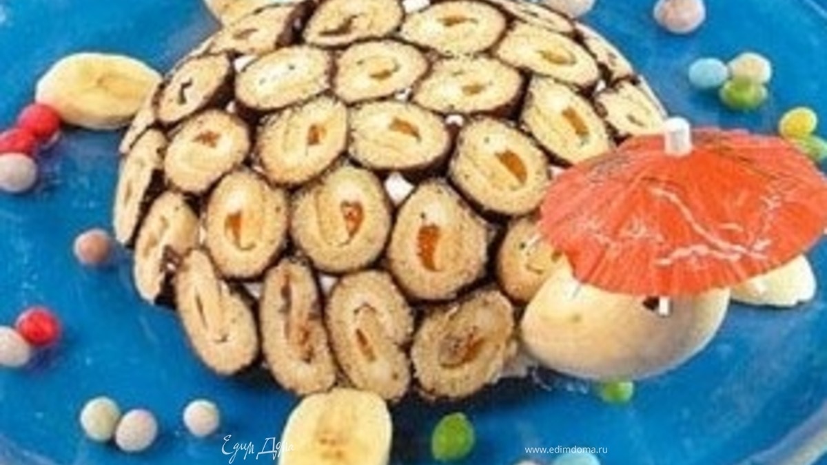 - Шаг 1Желатин замочить в 160 г холодной воды. Растворить на водяной бане. Охладить. Сливки взбить, постепенно добавляя сахар, положить варенье, орехи, тертую цедру лимона и взбивать еще 1–2 минуты, вливая тонкой струйкой желатин. Полусферическую форму выложить ломтиками мини-рулетов, заполнить сливочной массой, накрыть ломтиками рулетов и выдержать в холодильнике не менее 3 часов. Перед подачей выложить «черепаху» на блюдо. Из банана сделать «голову», «лапки» и «хвост», сбрызнуть их лимонным соком и закрепить на блюде.